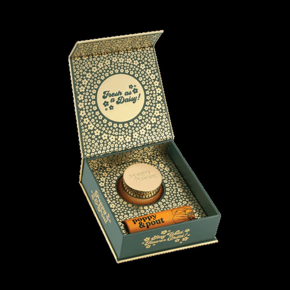 Step up your lip care routine with our Lip Care Duo! This gift set includes one matching lip balm and lip scrub in a green and gold, recyclable gift box.