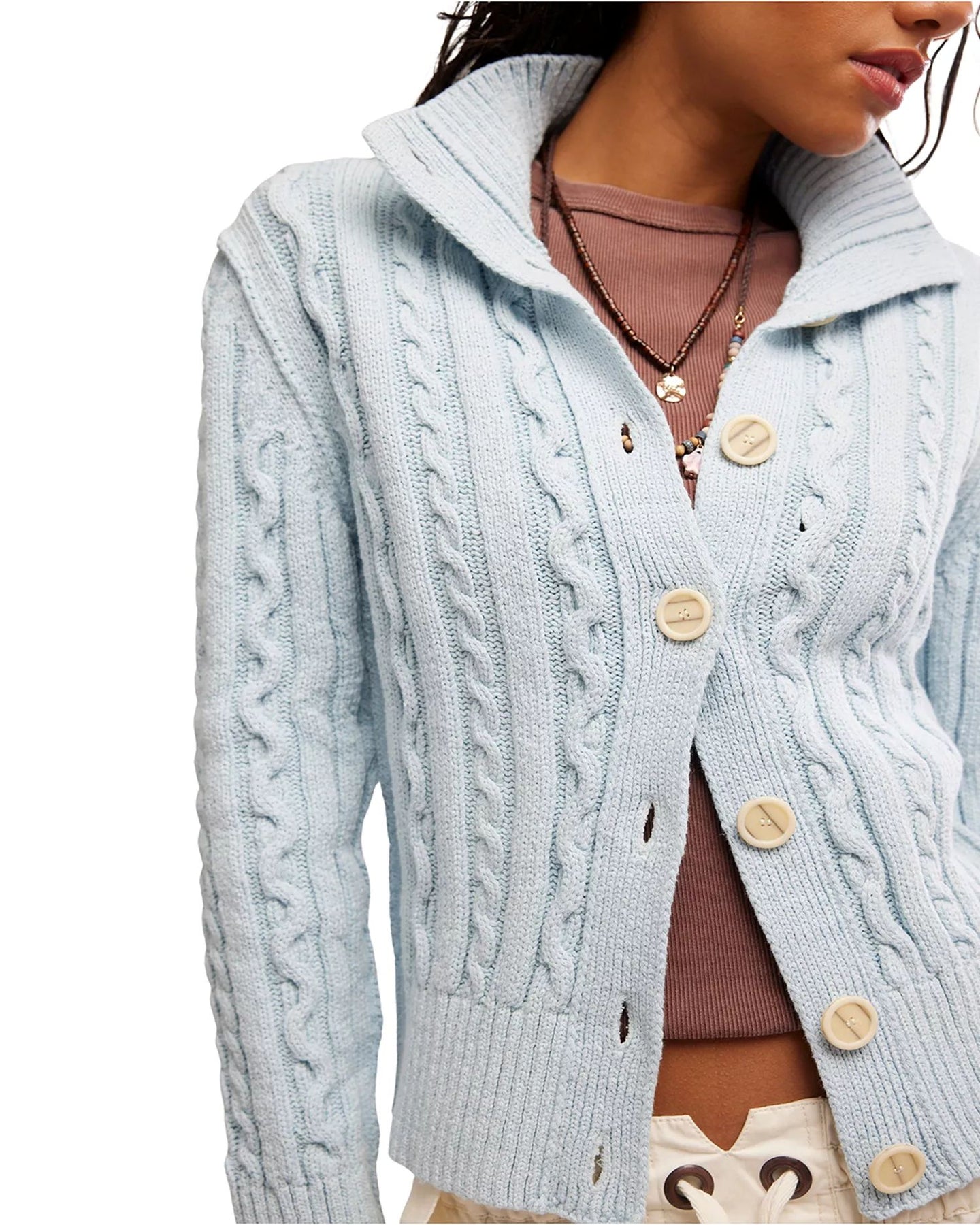 WTF Cable Collar Cardi in Clean Ivory by Free People—a textured cotton-blend essential that works as hard as you do. The signature cable knit and refined collar detail elevate any outfit, while the relaxed fit makes layering effortless. Soft, versatile, and endlessly wearable for everything from weekend casual to polished moments.