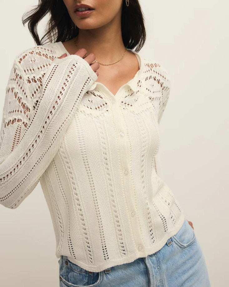 Its lightweight feel and button front make this crewneck cardigan easy to wear and layer. The unique crochet all-over detail updates your everyday top and jeans uniform.