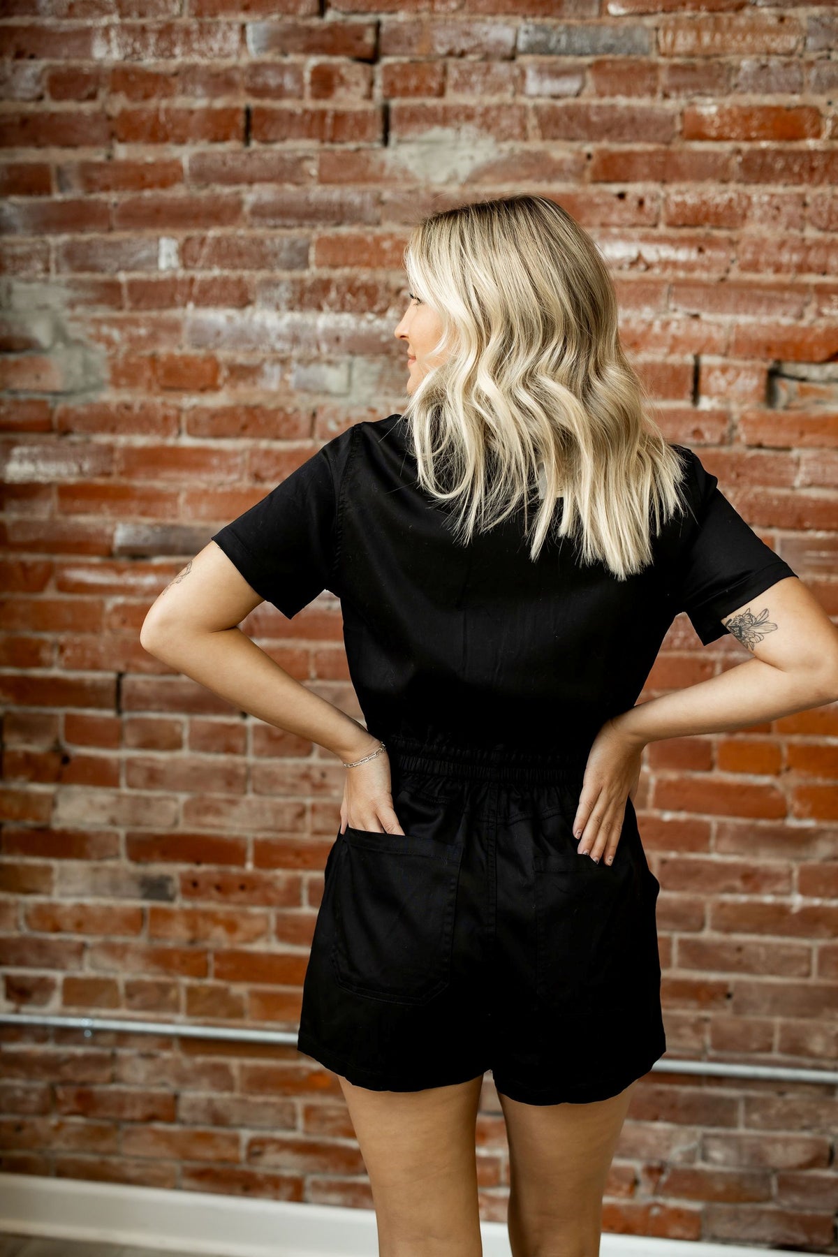 The Ashlynn Romper by Elan features convenient front and back pockets and a stylish zip-up design for easy wear and a flattering fit. Perfect for effortless, chic days out.