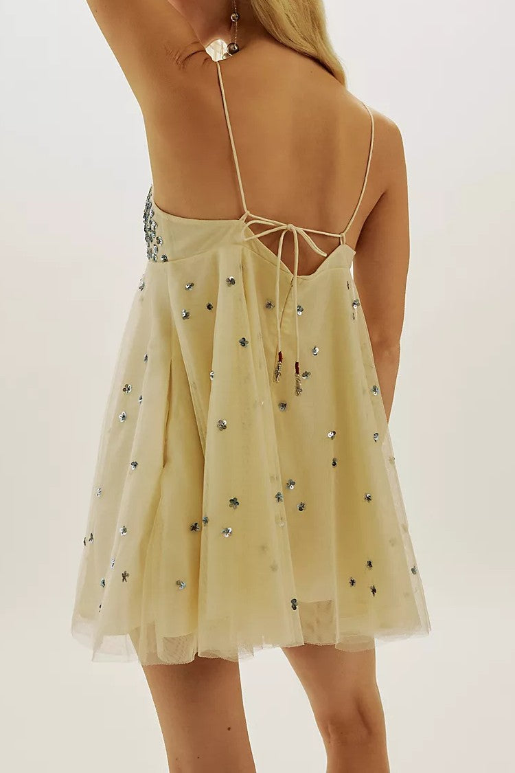 Elevate your mini dress collection with this enchanting design, featuring a playful tulle fabrication, empire-waist silhouette, and embellished details for the perfect added shine.