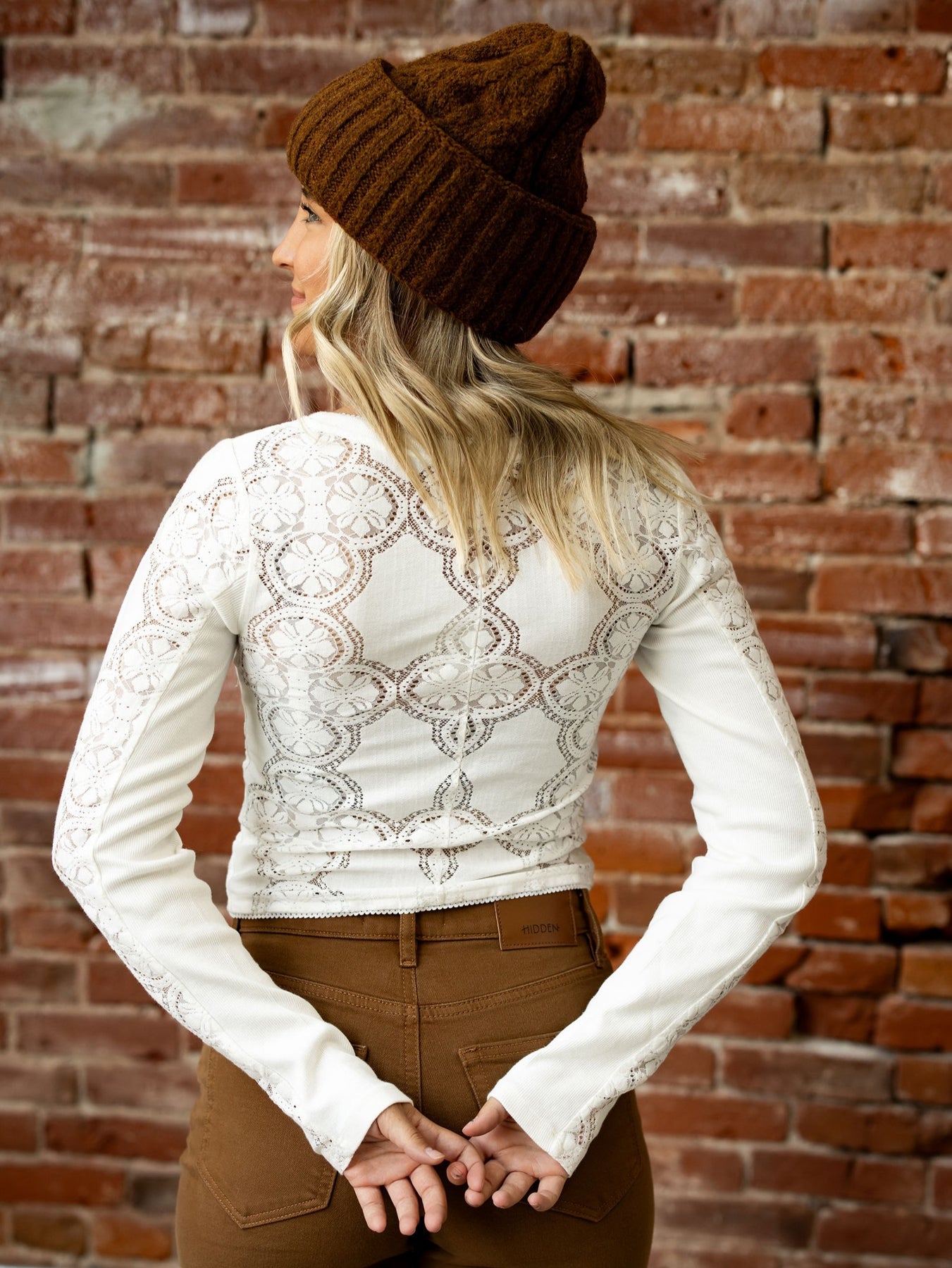 Add a dainty touch to your look with this sheer cotton-lace long sleeve, featured in a button-front style for a versatile piece that’s perfect for layering.