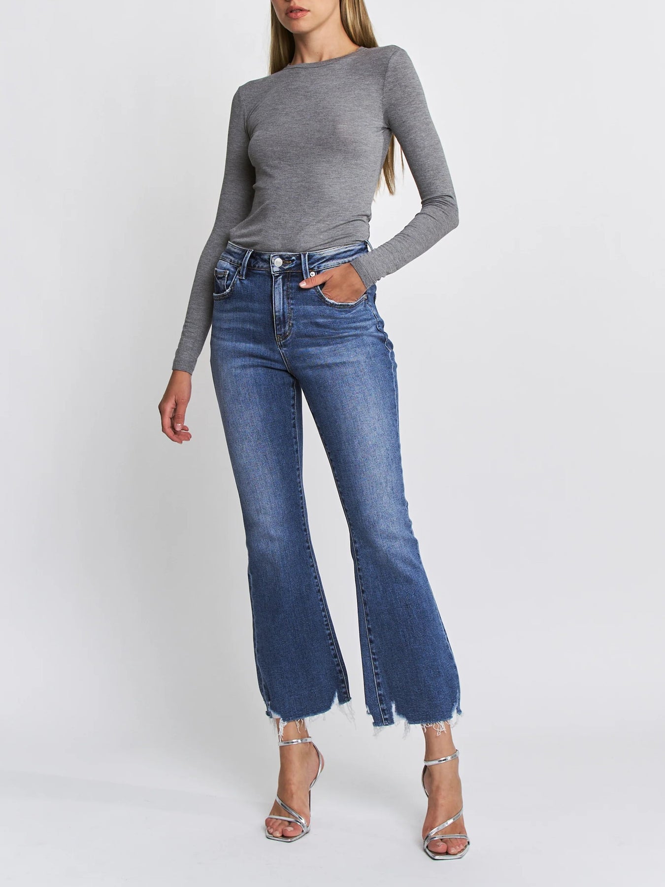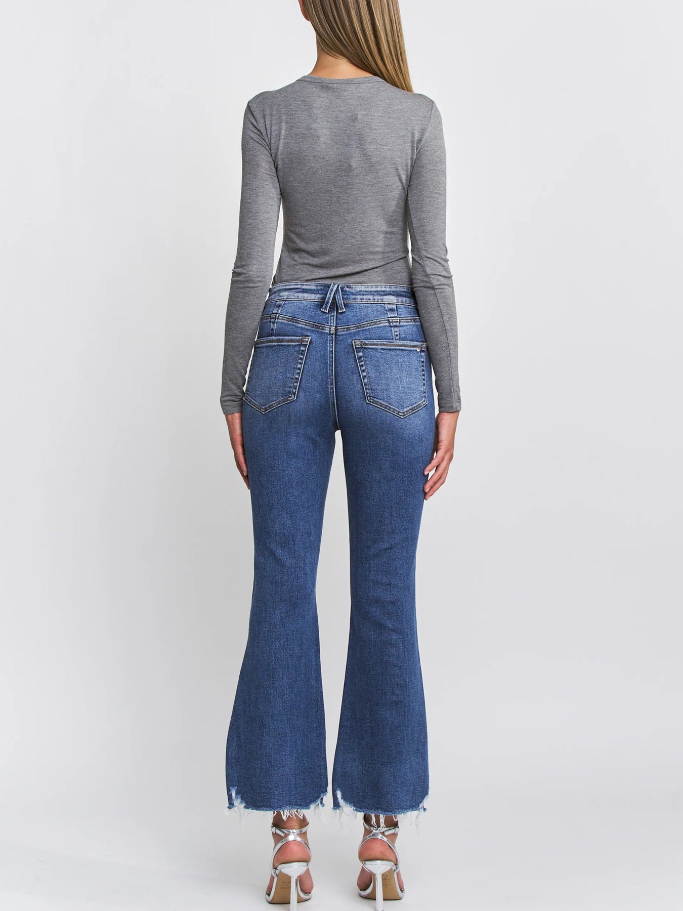 The Lights Out HR Flare features a high-rise fit with a flattering ankle flare silhouette and edgy raw hem. Crafted from soft Mica Denim, these jeans combine comfort and style for a modern, versatile look perfect for day-to-night wear.
