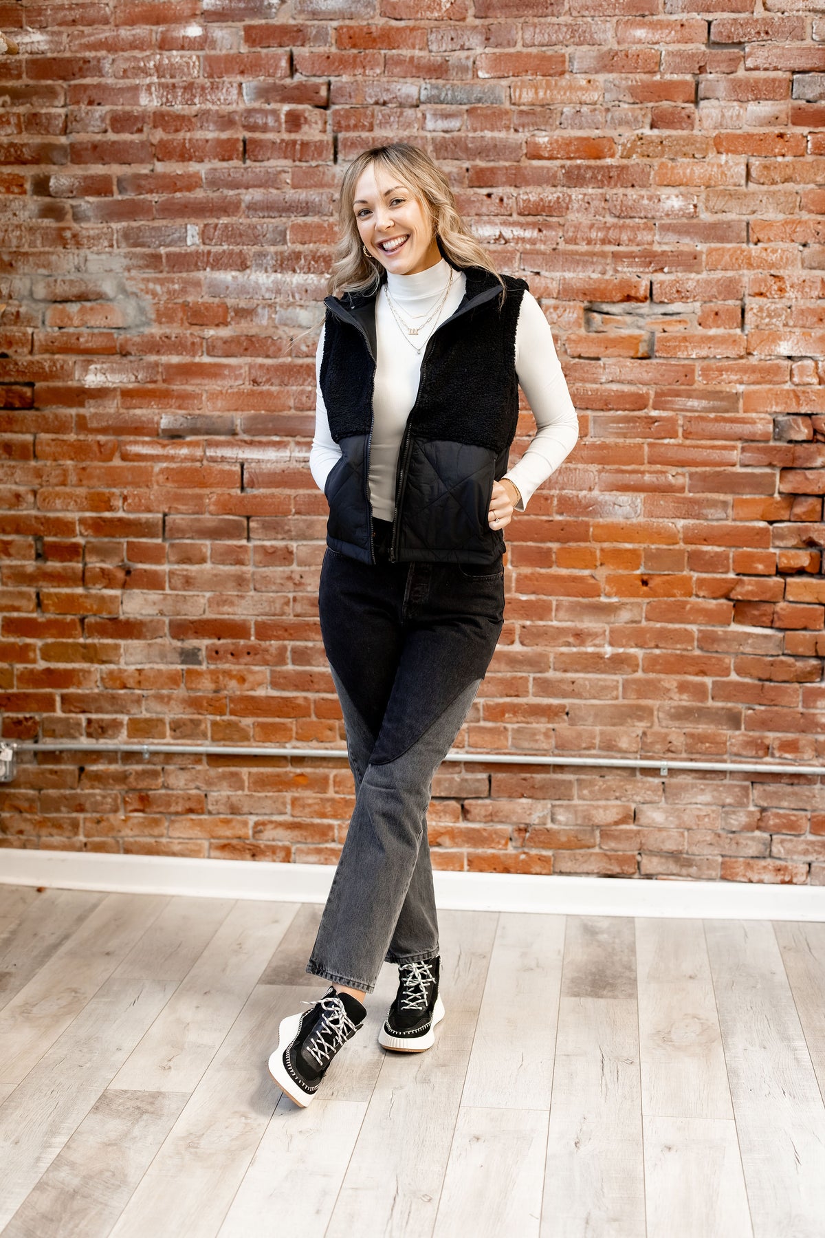So cozy and made for chilly adventures, this Thread & Supply sherpa vest features quilted puffer detailing, dual side pockets and zip front closure.