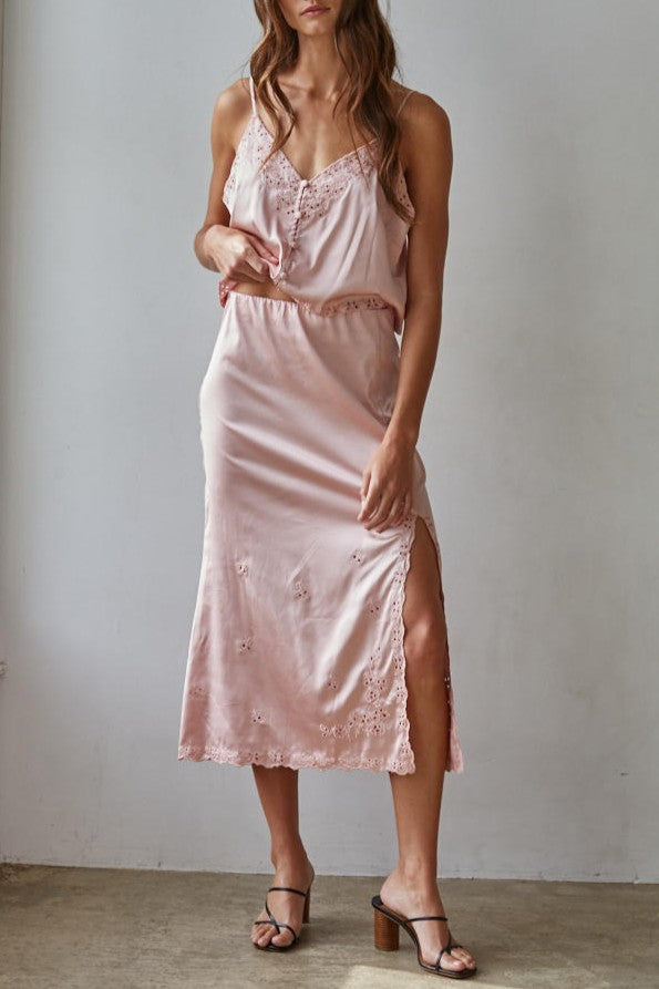 Sleek V-neck top in lustrous woven polyester satin, featuring delicate embroidery and adjustable sleeveless design. Front button closure for easy styling versatility. A refined piece that transitions effortlessly from day to evening. Pair with matching Kaci Midi Skirt.